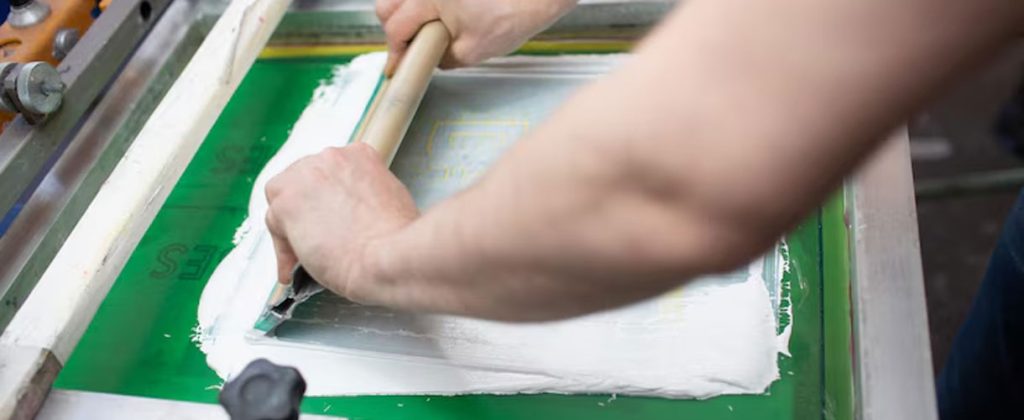 Screen printing pushes ink through a mesh stencil (a “screen”) onto the shirt. Each color has its own screen. The ink sinks into the fabric and dries flat, creating bright, smooth designs.